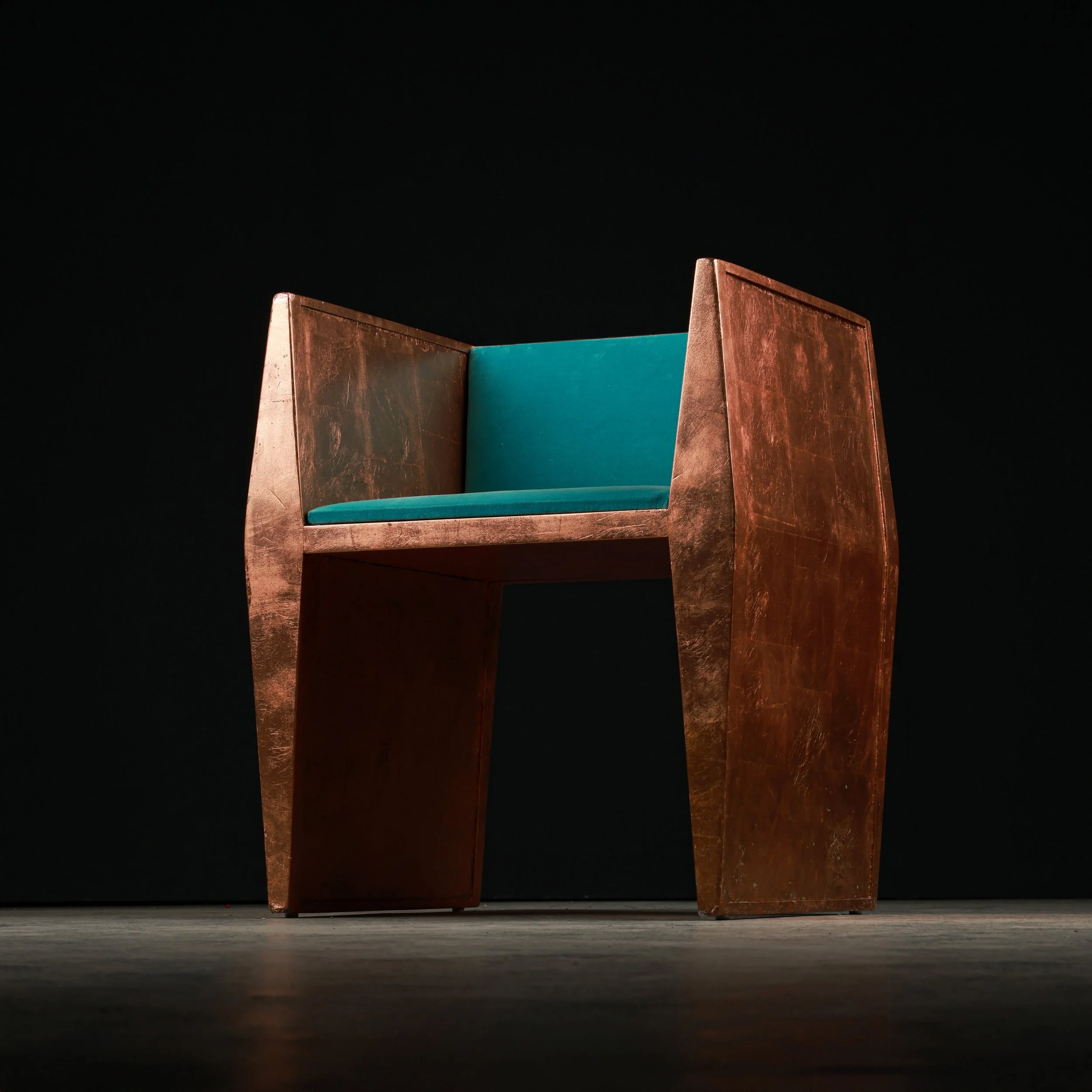 Materials: Solid walnut and precision-cut MDF body, finished in hand-applied copper leaf; velvet upholstery over premium foam on seat and back
